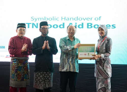 2026年3月3日,驻马来西亚大使欧阳玉靖和马来西亚总理府宗教事务部长祖基菲里共同出席斋月食品包捐赠仪式,马总理府宗教事务部副部长玛尔哈玛、项目合作方马来西亚穆斯林青年运动(ABIM)主席法米以及约1500位穆斯林民众参加活动。