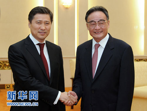 2011年6月15日,全国人大常委会委员长吴邦国在人民大会堂会见蒙古国总理巴特包勒德。