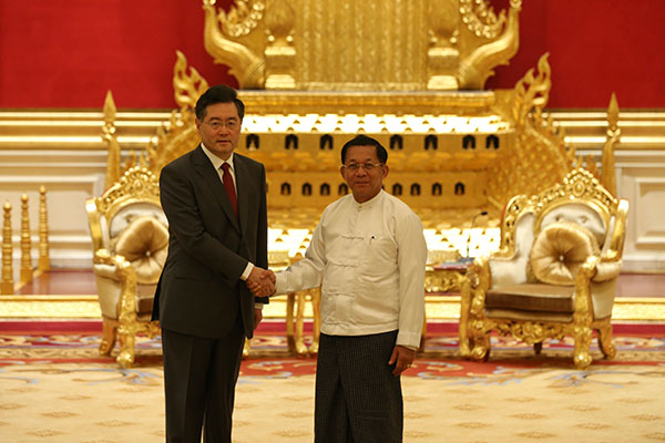 当地时间2023年5月2日,缅甸领导人敏昂莱在内比都会见到访的中国国务委员兼外长秦刚。