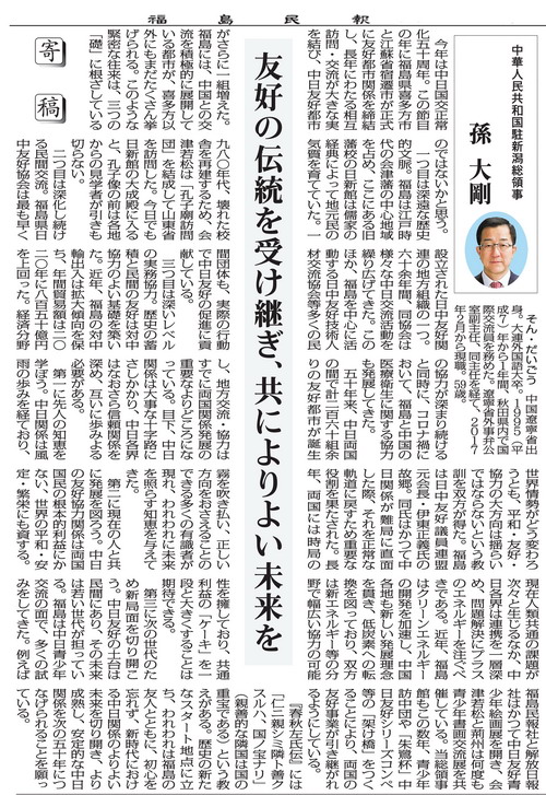 2022年8月30日,为纪念中日邦交正常化50周年,驻新潟总领事孙大刚在领区主流媒体《福岛民报》发表题为《继承友好传统,共创美好未来》的署名文章,全文如下: