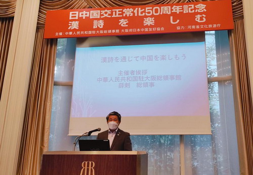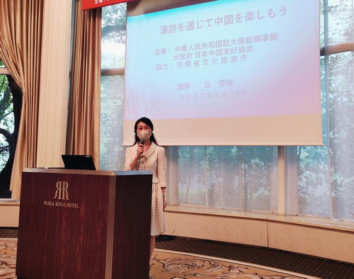 “青山一道同风雨,明月何曾是两乡”。2022年8月30日下午,驻大阪总领馆联合大阪府日中友好协会、河南省文化和旅游厅在大阪共同举办纪念中日邦交正常化50周年特别活动——“品味汉诗”汉诗讲座。讲座特别邀请到日本中华文学艺术家联合会副会长、随笔作家白雪梅老师主讲,驻大阪总领事薛剑、大阪府日中友好协会会长梶本徳彦、大阪府日本中国友好協会理事长青柳明雄出席,另有来自日本的70余名汉诗爱好者现场参加了本次讲座。