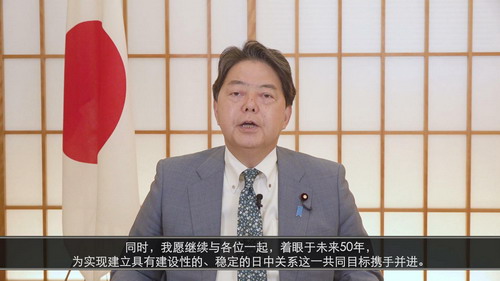 林芳正外相在视频致辞中向两国老一辈的战略远见和巨大勇气致以由衷敬意,表示邦交正常化50年来,日中关系取得巨大发展,双边贸易额较邦交正常化之初增长了120多倍,两国人员往来在疫情前达到1200万人次,这并非由于两国地理临近、历史文化渊源悠久就自然取得的成就,而是两国人民不懈努力的成果。为日中邦交正常化作出过重要贡献的大平正芳前首相曾表示,日中两国在未来时代或许遭遇很多惊涛骇浪,可能出现意见不同或利益冲突的局面,只要双方回顾2000多年友好交往和文化交流历史,不要失去今日拥有的信赖之心并持续付诸努力,我们的后代一定会为两国持久和平友好关系引以为豪。值此邦交正常化50周年之际,双方要铭记先辈的经验和智慧,自觉付出努力,面向下一个50年,朝着构建建设性、稳定的日中关系的共同目标携手前进。这既是继承前人的使命,也是我们对后代肩负的责任。