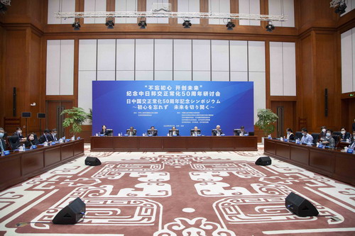 研讨会上,中日友好协会常务副会长程永华、中国国际交流协会副会长刘洪才、前中信集团董事长常振明、北京大学国际关系学院教授贾庆国、中国社科院亚太与全球战略研究院院长李向阳、社科院日本研究所所长杨伯江、中华日本学会会长高洪、中国外文局亚太传播中心总编辑王众一,日本前驻华大使宫本雄二、前国际交流基金理事长小仓和夫、前防卫大学校长五百旗头真、经团联副会长佐藤康博、松下集团全球副总裁本间哲朗、东京大学教授高原明生、川岛真、言论NPO代表工藤泰志等16位各界代表围绕“邦交正常化50年经验启示”和“中日关系发展及各领域合作展望”两阶段主题进行了深入探讨,达成了积极共识。