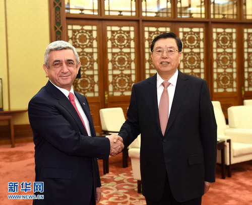 在会见萨尔基相时,张德江说,亚美尼亚是中国在独联体地区的重要合作伙伴。习近平主席提出建设“丝绸之路经济带”的战略构想,为双方在新时期深化合作提供了契机。中国全国人大与亚美尼亚议会有着良好的合作基础。两国立法机关要进一步开展立法经验交流与合作,积极推进政党和社会团体各层级、各部门间友好交往,增进两国人民的了解和友谊,充分发挥好友好小组作用,为两国合作创造良好的人文和法制环境,助力双边关系新发展。