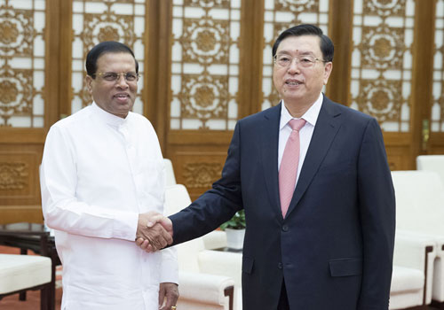 在会见西里塞纳时,张德江说,中斯是传统友好邻邦,两国关系经受住了各种考验,成为值得信赖的合作伙伴和同舟共济的患难之交。当前中斯面临新的合作机遇,两国立法机关有责任有义务将中斯友谊继承好、维护好、发展好。中国全国人大愿加强与斯里兰卡议会的友好往来,以落实习近平主席与总统先生此次会谈成果为契机,加强交流合作,特别是立法领域合作,为双方扩大务实合作提供法律保障,为促进各界友好往来创造便利条件,推动中斯战略合作关系再上新台阶。