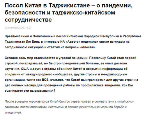 2020年10月23日,驻塔吉克斯坦大使刘彬接受塔《阿维斯塔》通讯社书面采访,就中塔抗疫、政治、安全、经贸、人文等各领域合作及中美关系、加强国际抗疫合作和习近平主席在联合国成立75周年纪念峰会、第75届联大一般性辩论等高级别会议发表重要讲话等问题回答提问。文章全文如下: