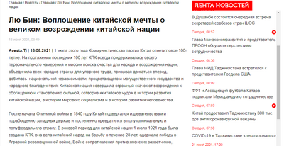 2021年6月18日,塔吉克斯坦主流媒体“阿维斯塔”通讯社网站刊登驻塔吉克斯坦大使刘彬《实现中华民族伟大复兴的中国梦——隆重庆祝中国共产党成立100周年之一》署名文章。全文如下: