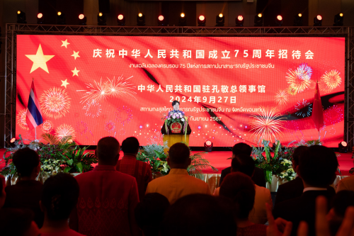 2024年9月27日,驻孔敬总领馆举办庆祝中华人民共和国成立75周年招待会。驻孔敬总领事刘红梅、泰东北二十府府尹及代表、政、商、侨、学及各界友人、驻孔敬领团、华侨华人、中资机构及留学生代表约500人出席。