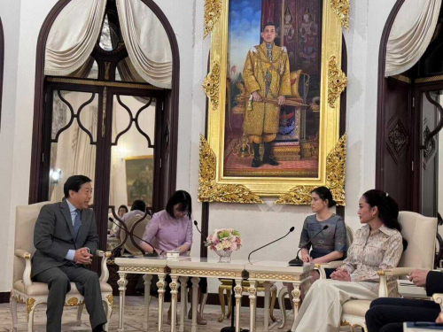 2024年10月16日,驻泰国大使韩志强拜会泰国总理佩通坦,并转交驻泰国使馆和泰国中国企业总商会为泰国洪灾筹集的赈灾善款。泰国外长玛里、总理秘书长蓬敏、外交部次长艾斯丽,驻泰国使馆主要外交官以及泰国中国企业总商会代表等参加。
