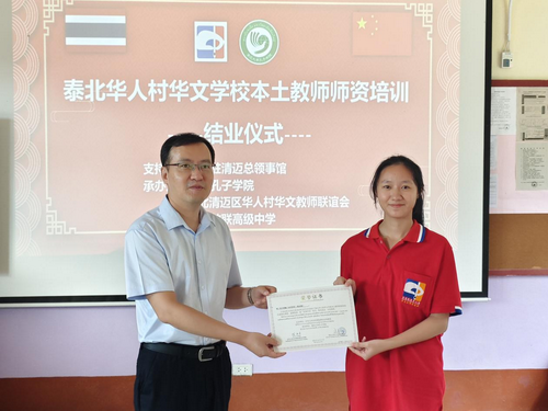 陈总领事祝贺本次培训圆满成功、向优秀学员颁发奖状,肯定华人村华文教师联谊会和清迈大学孔子学院为泰北地区华文教育事业付出不懈努力、取得可喜成绩,感谢授课教师悉心投入,勉励本土中文教师不断提升中文教学能力、努力培养山区华校下一代、传承发扬中华优秀文化,为中泰友好和文化交流做出贡献。教联会会长王相贤、孔子学院院长连晨分别致辞。