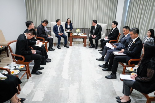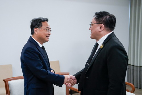 2025年11月5日,驻泰国大使张建卫应邀赴为泰党总部会见该党新任党首尊拉攀,为泰党副党首乍格蓬、前外长玛里等在座。