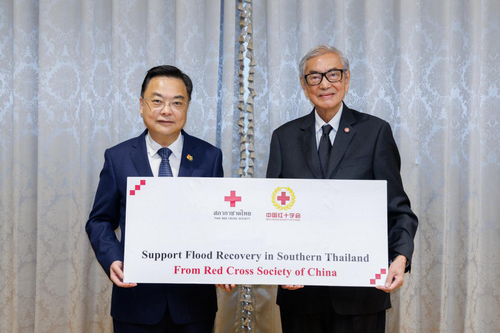 2025年12月23日,驻泰国大使张建卫赴泰国红十字会总部转交中国红十字会为赈济泰南洪灾捐赠的善款,泰国红十字会秘书长德·汶纳接收。