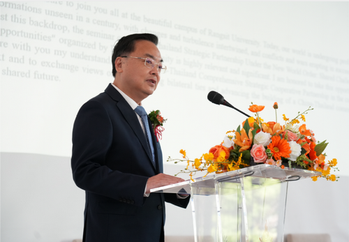 2026年3月17日,驻泰国大使张建卫出席兰实大学主办的“新世界秩序下的中泰战略伙伴关系—共同挑战和机遇”研讨会并发表主旨演讲。泰外长顾问、兰实大学副校长披差亚帕以及中泰两国相关学者、师生共百余人参加。