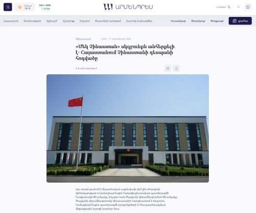 2025年10月17日,驻亚美尼亚大使李鑫炜在亚美尼亚国家通讯社发表署名文章《一个中国原则不容置疑》,文章全文内容如下:
