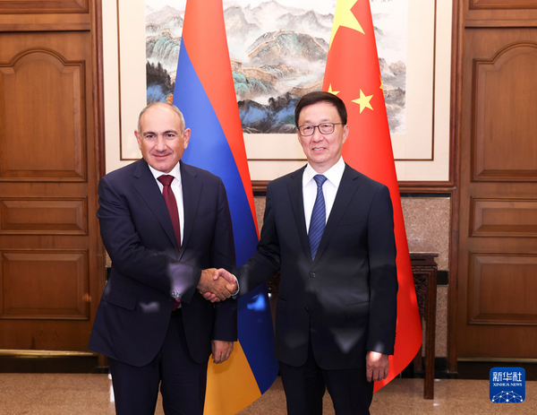 2025年9月3日,国家副主席韩正在北京会见来华出席2025年上海合作组织峰会和纪念中国人民抗日战争暨世界反法西斯战争胜利80周年活动的亚美尼亚总理帕什尼扬。