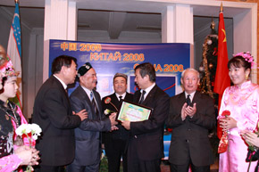 在开幕式结束后,乌兹别克斯坦共和国文化中心为了表彰中国外交官对促进中乌两国民族文化交流做出的贡献,特向于洪君大使、陈维伟领事、许涛一秘颁发了证书。