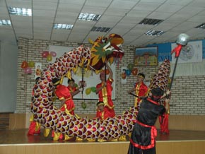 在联欢晚会上,东方学院汉语专业的学生们表演了舞狮、舞龙、相声、武术、中文诗朗诵、中文歌曲、多民族舞蹈等精心准备的文艺节目。同学们在舞台上展现出来的才艺,博得中国外交官和在场师生们的一阵阵掌声。
