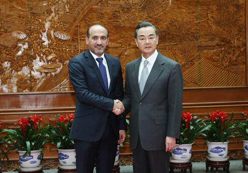 2014年4月16日,外交部长王毅会见应中国人民外交学会邀请访华的叙利亚反对派组织“反对派和革命力量全国联盟”主席杰尔巴一行。