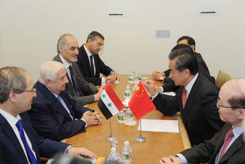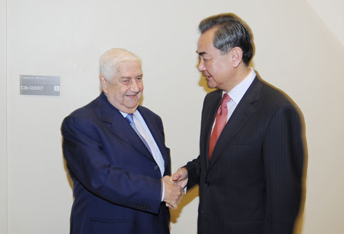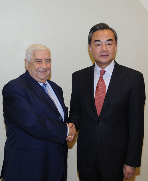 当地时间9月30日,外交部长王毅在美国纽约联合国总部会见了叙利亚副总理兼外长穆阿利姆。
