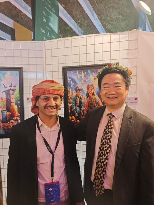 邵峥代办在埃尔亚尼部长的陪同下,仔细查看了各个展台,并与也门艺术家亲切交流。