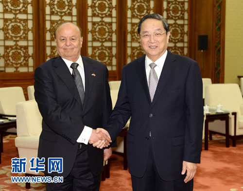 2013年11月14日,全国政协主席俞正声在北京会见也门总统哈迪。
