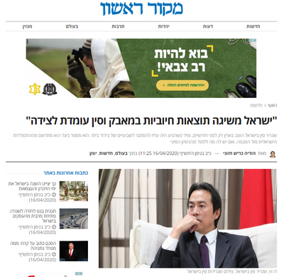 2020年4月17日,以色列发行量最大的希伯来语报纸《今日以色列》在其周末特刊《第一信源》及网站刊登驻以色列大使杜伟书面采访。杜大使就中以合作抗击新冠肺炎疫情、中以关系前景、中国发展道路以及涉疆、涉港等问题回答了对方的提问。全文如下: