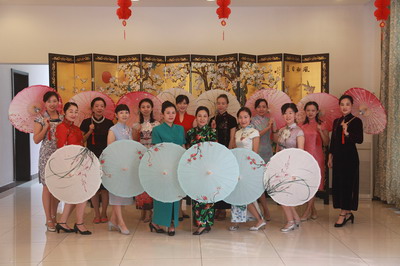 之后,伴随着《太湖美》和《梨花颂》的悠扬曲调,江参赞和妇女小组成员一起表演了精心编排的“旗袍秀”和伞舞。大家身着华美的旗袍款款而行,举手投足间尽显端庄娴雅的东方韵味和自信向上的精神风貌。台下来宾们连声赞叹,热烈的掌声经久不息。