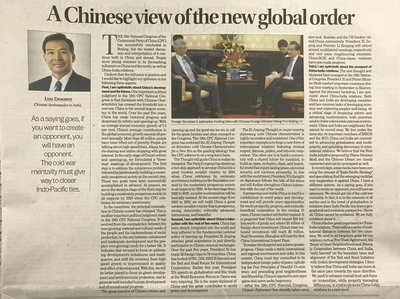 2017年11月15日,驻印度大使罗照辉在印度知名英文媒体《论坛报》撰文《中国的蓝图,世界的机遇》。全文如下: