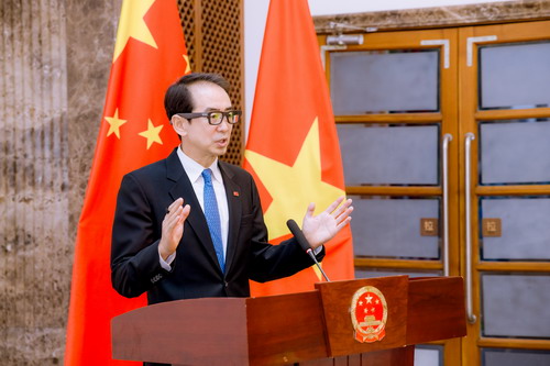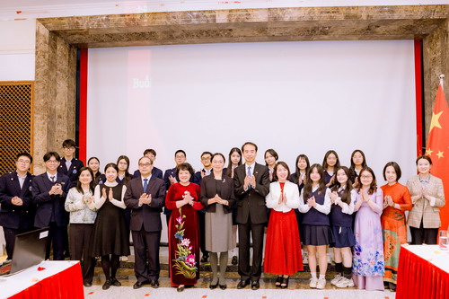 何炜大使致辞勉励同学们循着两国革命先辈的红色足迹,重温中越守望相助的峥嵘岁月,坚定传承两国睦邻友好,以青春之力为中越命运共同体建设添砖加瓦。大使夫人孙畅介绍了中国教育及文化旅游的最新发展情况。