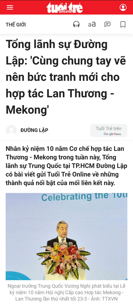 2026年3月25日,驻胡志明市总领事唐立在越南《年轻人报》发表署名文章《携手绘就澜湄合作新篇章》。文章全文如下: