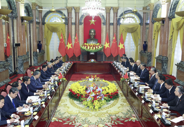当地时间2023年12月13日上午,中共中央总书记、国家主席习近平在河内主席府同越南国家主席武文赏举行会谈。