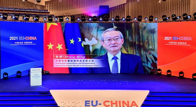2021年9月17日至19日,第十六届中国-欧盟投资贸易科技合作洽谈会在成都中国-欧洲中心举办。驻欧盟使团团长张明大使在开幕式上发表视频致辞,全文如下:
