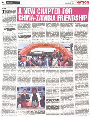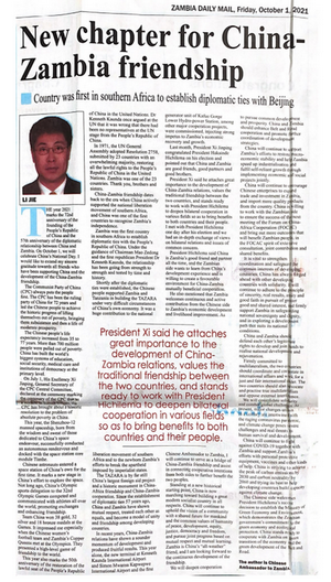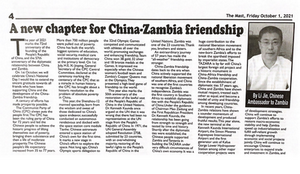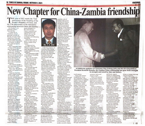 2021年10月1日,驻赞比亚大使李杰在《赞比亚时报》《每日邮报》《新闻挖掘者》《桅杆报》等赞比亚主流媒体发表题为《携手开创中赞友谊新篇章》的署名文章,庆祝中华人民共和国成立72周年,期待中赞友谊继续深化发展。全文如下: