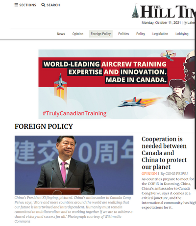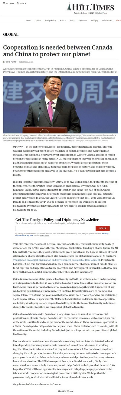 2021年10月11日,驻加拿大大使丛培武在加拿大主流媒体《国会山时报》发表题为《携手共进,推动人与自然和谐共生》的署名文章。全文如下: