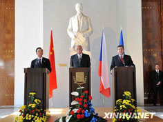 2009年5月20日,国务院总理温家宝在捷克首都布拉格出席了第十一次中欧领导人会晤,并在会晤后与欧盟轮值主席国捷克总统克劳斯和欧盟委员会主席巴罗佐共同会见了记者。温总理在会见记者时发表的讲话全文如下: