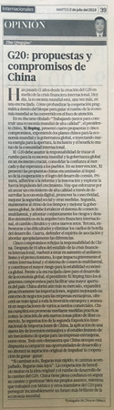 2019年7月2日,驻墨西哥大使祝青桥在墨主流媒体《经济学家报》发表题为《G20:中国的主张和承诺》的署名文章。文章指出,二十国集团领导人第十四次峰会于6月28日至29日在日本大阪召开。中国国家主席习近平发表题为《携手共进,合力打造高质量世界经济》的重要讲话,提出了四大主张,宣示了五大承诺,为世界经济和全球治理贡献了新的中国方案,也为国际社会开放包容、互利共赢注入了新的正能量。文章全文如下: