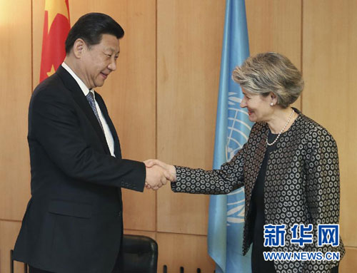 当地时间3月27日,国家主席习近平在巴黎联合国教科文组织总部会见该组织总干事博科娃。