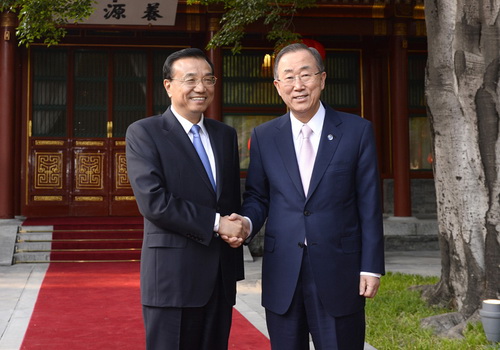 2014年5月19日,国务院总理李克强在钓鱼台养源斋会见联合国秘书长潘基文。
