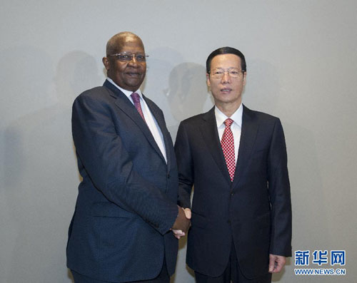 当地时间9月22日,前往纽约出席联合国气候峰会的国家主席习近平特使、国务院副总理张高丽在纽约联合国总部会见第69届联合国大会主席库泰萨。