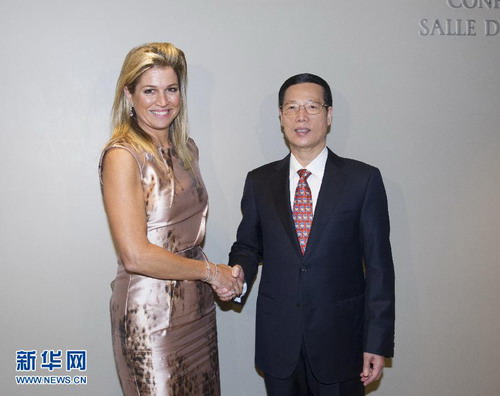 当地时间9月23日,出席联合国气候峰会的国家主席习近平特使、国务院副总理张高丽在纽约联合国总部会见了荷兰王后马克西玛。
