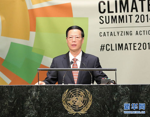 当地时间9月23日,国家主席习近平特使、国务院副总理张高丽在纽约联合国总部出席联合国气候峰会,在峰会全会上发表题为《凝聚共识落实行动构建合作共赢的全球气候治理体系》的讲话。
