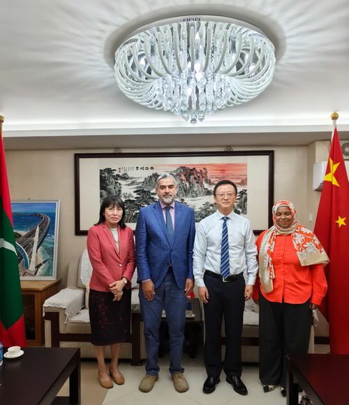 2025年9月24日,驻马尔代夫大使孔宪华应约会见联合国开发计划署(UNDP)新任驻马代表阿德南·奇马,联合国开发计划署驻马副代表颜佩川等在座。