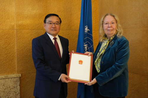 新任常驻联合国日内瓦办事处和瑞士其他国际组织代表、特命全权大使贾桂德向联合国日内瓦办事处总干事递交全权证书