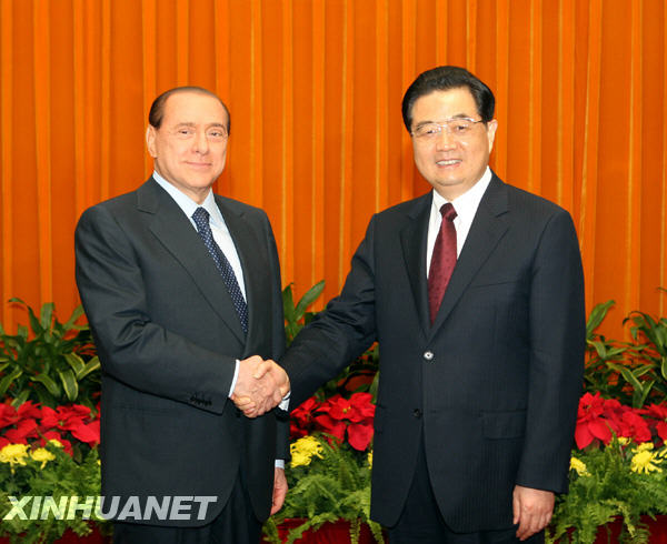 10月23日,中国国家主席胡锦涛在北京人民大会堂会见来华出席第七届亚欧首脑会议的意大利总理贝卢斯科尼。