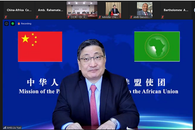 2021年10月20日,驻非盟使团与埃塞俄比亚对话研究与合作中心联合举办“面向未来—展望中非合作新时代”视频研讨会。驻非盟使团团长刘豫锡大使,中非合作论坛非方共同主席国塞内加尔常驻非盟代表迪奥普大使,非盟驻华大使奥斯曼,埃塞俄比亚外交部前常秘特克达大使,联合国非经委宏观经济司司长阿玛,中国现代国际关系研究院非洲所、中国国际问题研究院发展中国家研究所、亚的斯亚贝巴大学和平安全研究所、浙江师范大学非洲研究院等中非智库和机构负责人以及非盟委员会和非经委官员、非洲国家常驻非盟外交官、中外媒体等应邀与会。
