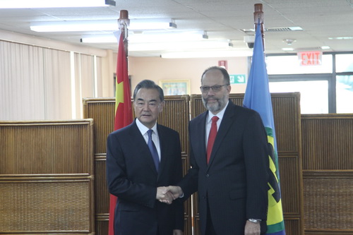 当地时间2018年9月22日,国务委员兼外长王毅在乔治敦会见加勒比共同体秘书长拉罗克。