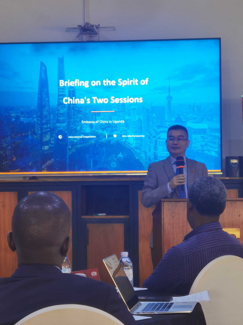2026年3月17日,驻乌干达使馆临时代办范学成应邀出席乌知名智库发展观察中心举办的研讨会,并就全国两会精神和中乌合作吹风。乌政府、智库及媒体等近百人通过线上线下方式参加。