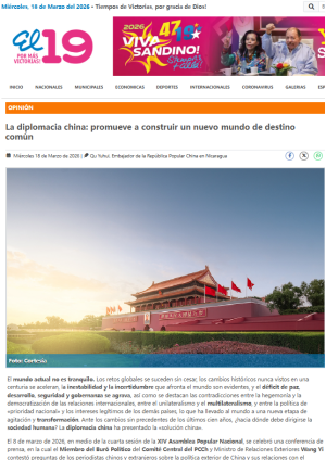 2026年3月18日,驻尼加拉瓜大使瞿瑜辉在尼官媒《19数字报》发表署名文章《中国外交:推动建设人类命运共同体》,全文如下: