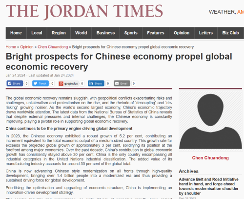 H.E. Chen Chuandong, Chinese Ambassador to Jordan, has authorized a signed article titled ”Bright Prospects for the Chinese Economy Propel Global Economic Recovery". The article was published in mainstream Jordanian media on 24 January, where Ambassador Chen highlights the remarkable achievements and steadfast commitment to opening-up in the Chinese economy. He underscores its bright prospects and pivotal role in propelling the global economic recovery.