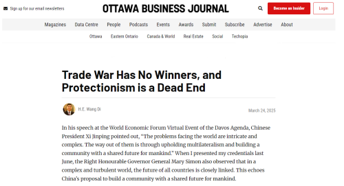 On March 24, 2025, Chinese Ambassador to Canada Wang Di published a byline article titled "Trade War Has No Winners, and Protectionism is a Dead End" on the Ottawa Business Journal. The full text of the article is below: